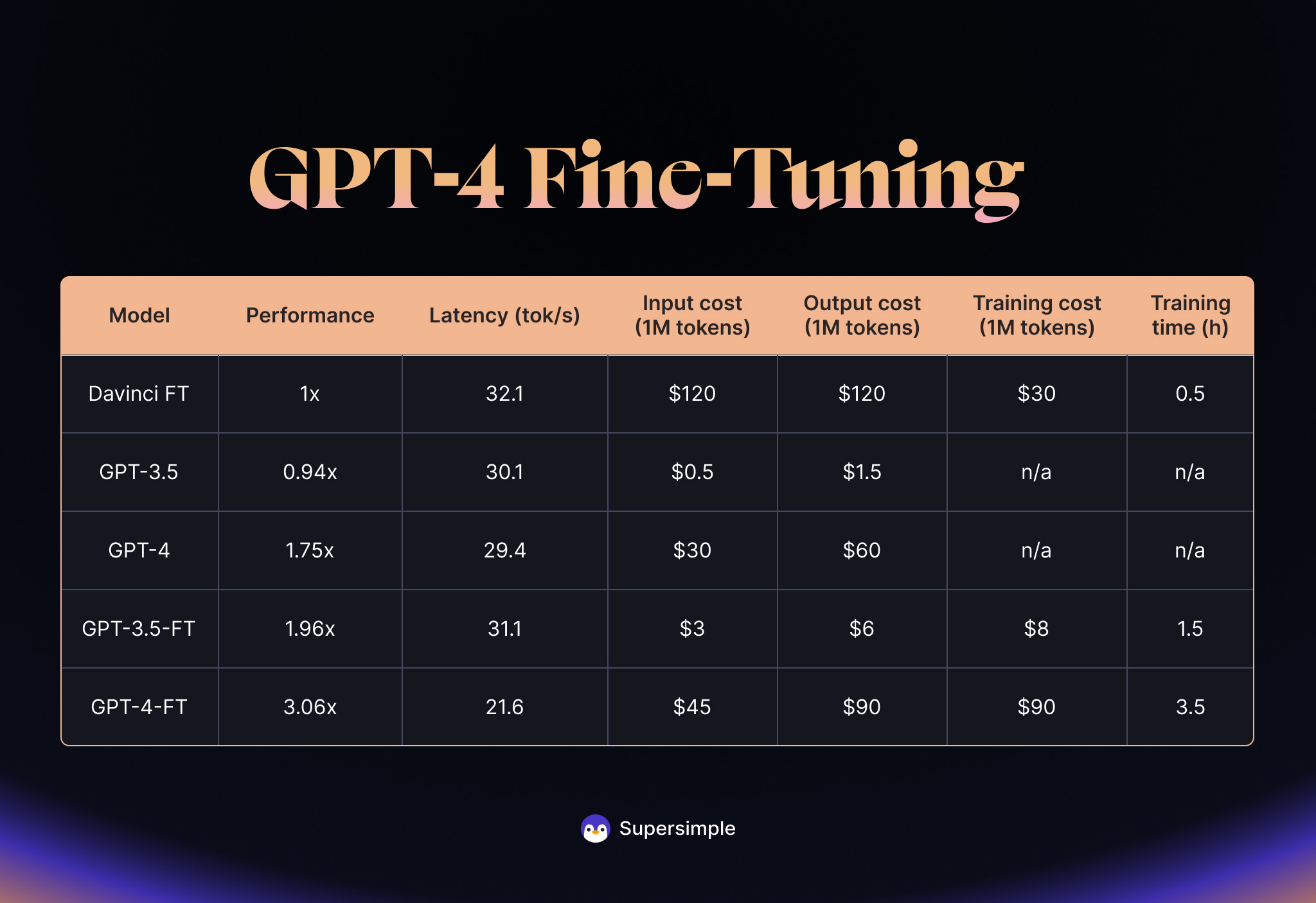 Unsurprisingly, a fine-tuned GPT-4 greatly outperforms fine-tuned GPT-3.5 (more than 50% improvement for our use case!). We’ll go deeper into how we use these models below, but let’s start by comparing several of the OpenAI-based models we use at Supersimple: