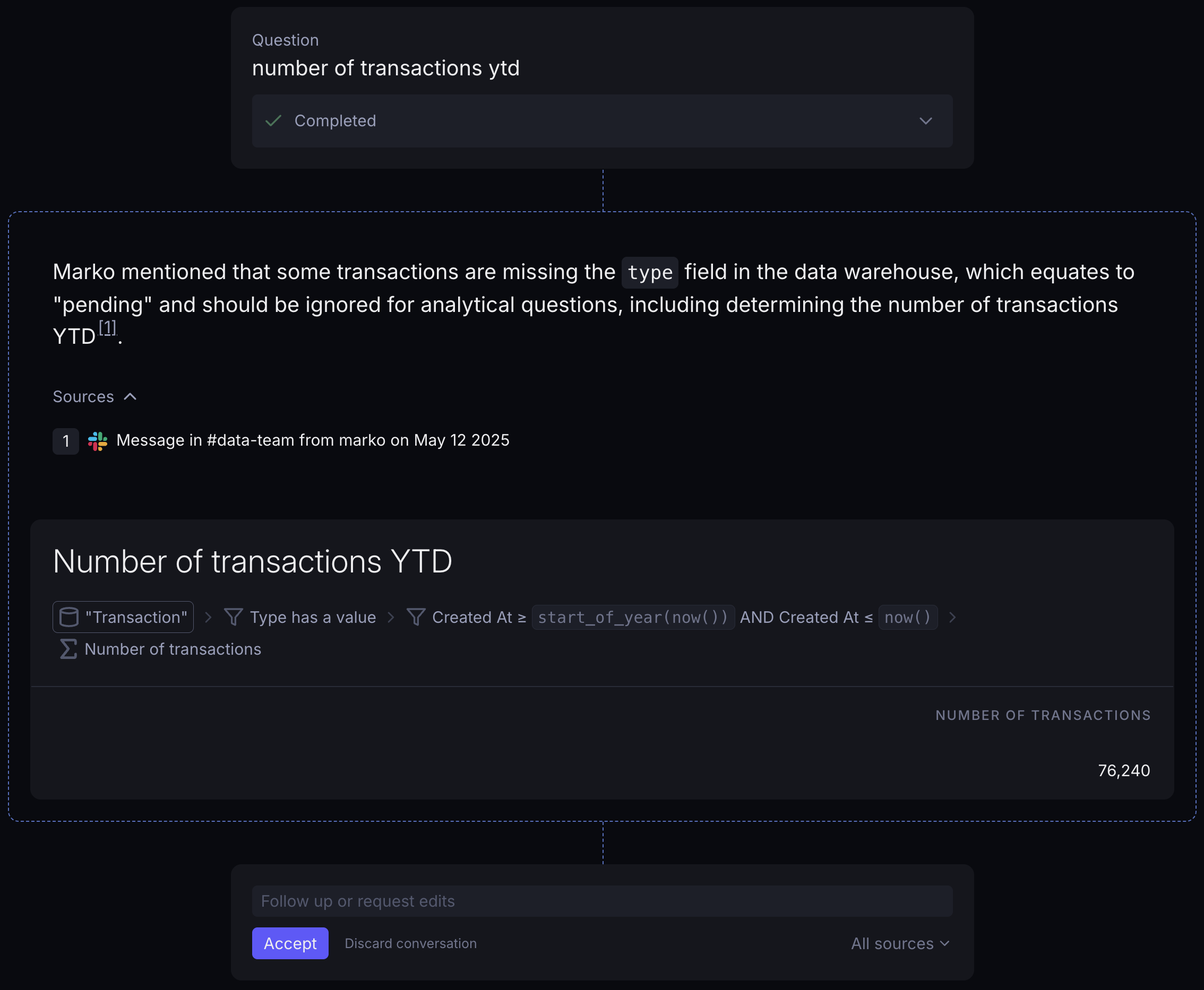 While investigating the data, the agent found a message from a team member in the #data-team Slack channel from May 2025, noting that transactions missing the type field are actually pending transactions and should be excluded from most analytical queries.