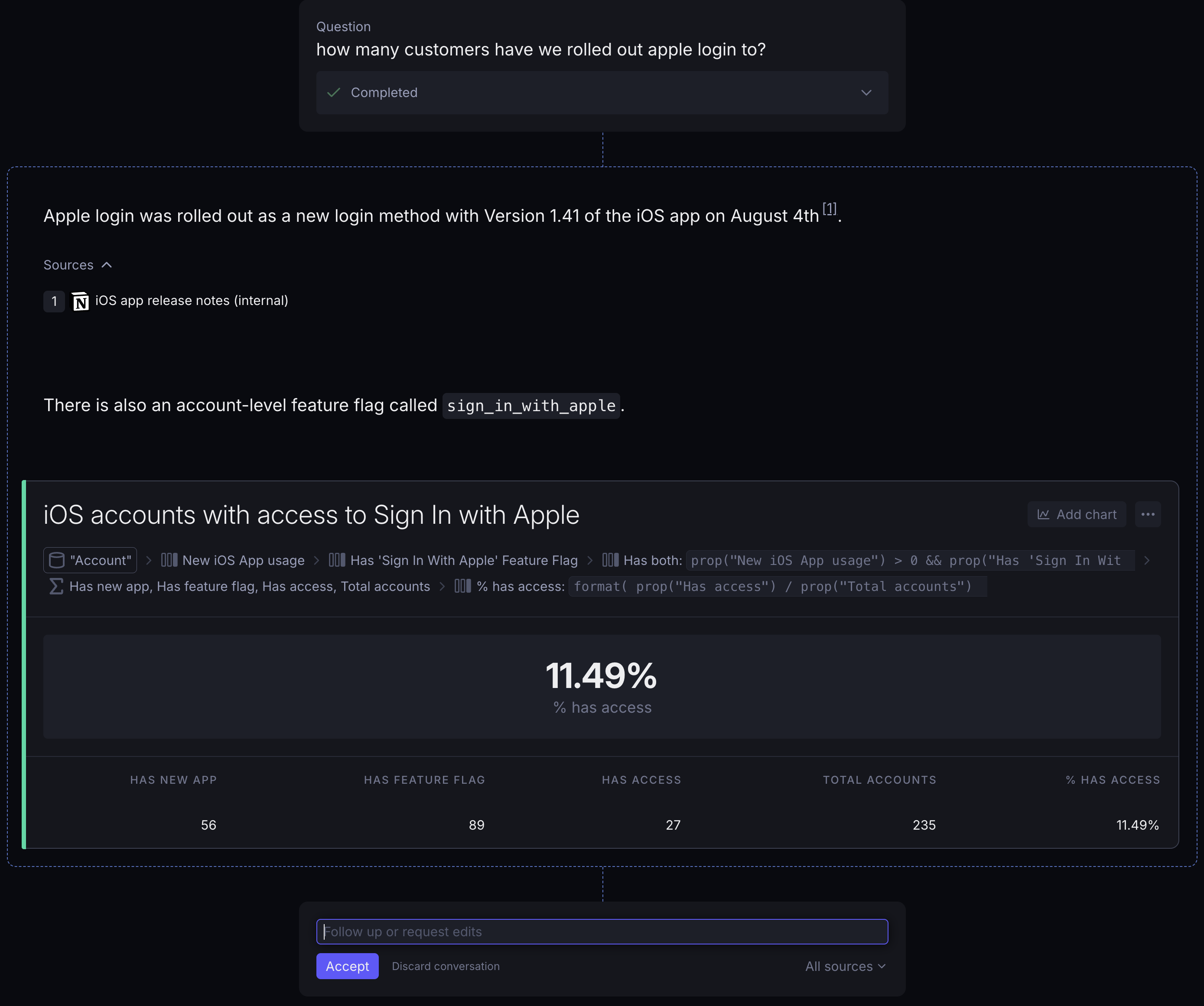 A user asks: "How many customers have we rolled out Apple login to?"