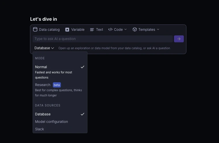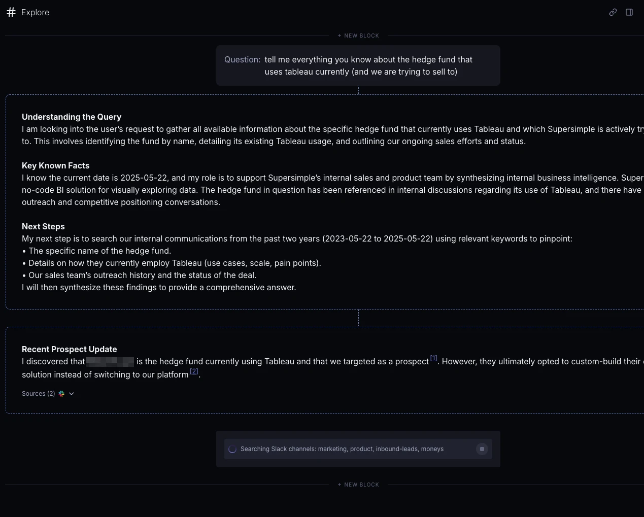 Our new Research agent can run a large number of searches across both your data warehouse & unstructured data sources. Currently only available to select accounts – contact us for access!